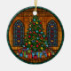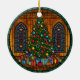 A beautiful round design showcasing a glowing Christmas tree surrounded by colorful gifts in front of elegant stained-glass windows. The rich colors and intricate details create a warm, festive atmosphere—perfect for adding holiday charm and elegance to your Christmas tree decor.