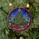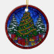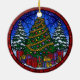 This gorgeous round ceramic ornament features a classic holiday scene rendered in a vibrant stained glass style. A large, richly decorated Christmas Tree, wrapped in gold tinsel and colorful baubles, is surrounded by a bounty of brightly wrapped gifts. Flanking the tree are two snow-covered pine trees, all set against a beautiful, starry blue sky with a deep red border. This keepsake captures the joy of Christmas morning and is a perfect holiday gift or a dazzling addition to your seasonal home decor.