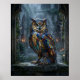 A stunning stained glass owl perches silently in a moonlit cloister garden, glowing with jewel tones of sapphire blue, ruby red, emerald green, amber gold, and violet light. Intricate feather panels, radiant eyes, and elegant dark leading create a handcrafted cathedral-inspired masterpiece. Ivy arches, candlelit alcoves, silver mist, and soft moonbeams add mystery and serenity to the scene. Rich in detail and atmosphere, this artwork is ideal for libraries, reading rooms, gothic décor, owl lovers, and collectors seeking colorful spiritual wall art.