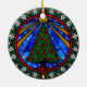 This exquisite round ceramic ornament features a magnificent Christmas Tree, heavily decorated with red baubles, set against a starburst background of blue and gold light—all designed in a classic stained glass style. What makes this piece unique is the rich, detailed border of white and green Poinsettia-style flowers (or similar festive florals) and a red band, giving it a luxurious, tapestry-like feel. It's an artistic, beautiful Christmas keepsake and a perfect unique holiday gift for those who appreciate ornate and colorful seasonal decor.