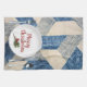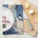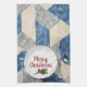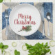 Vit middagsplatta med silvergods på blå och elfenbensfärgad abstrakt mönster och God jul. Text kan redigeras.