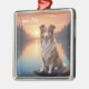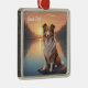 Brunt och vitt standardkollie sitta vid solnedgång med sjö. Lägg till den här bilden i andra produkter. Lägg också till din egen text. Många husdjur i min butik.