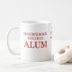 15 eller 18 uns mugg, som deklarerar din SR alumstatus och som är märkt med ett stickprov, allt i rött