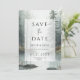 Bjud in dina gäster till en fest under baldakinen med Evergreen Mist | Rustic Watercolor Forest Wedding Save the Date. Detta förtrollande kort har en dimmig, atmosfärisk akvarellskogsillustration i djupa smaragd- och salviafärger som perfekt fångar den tysta skönheten i en skogsutflykt eller en rustik bergsbröllopsfest.