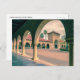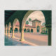 Bilden visar en vy av Stanford Universiteten arkitektur med en serie båggångar som stöds av kolumner. Förgrundsinformationen visningar en gångväg med en sväng som går mot en gård. I bakgrunden kan man se ett byggnad med ett röddömt tak och ett framstående torn, med handflatan träd som ram. Arkitekturen kännetecknas av sandstenskonstruktionen och bågöppna öppningar.