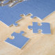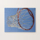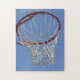 Den här basketbollens solupplysta nät ring mot ett tydligt blå himmel skapar en intressant design att pussla över. Det här sporttemat pussel är rött, vitt och blått och sportiskt. Bilden är ett originalsportfoto av JLW_PHOTOGRAPHY.