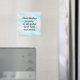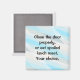 Den här magneten lyder: "Stäng dörren ordentligt eller ät förstörd lunch kött. Ditt val", mot bakgrund av abstraktens bakgrundsdesign, som huvudsakligen består av blått och beige nyanser. En vänlig påminnelse - eller varning - för dem som tenderar att dra sig av och låta kylskåpet "stänga" av sig själv (vår gör inte det.)