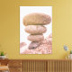 En stapel med fyra släta, grått-stenar balanseras omsorgsfullt på ett större, texturerat sten. Stenarna är ordnade i pyramidform, med den största stenen överst och den minsta vid grund. Bakgrunden är en mjuk, suddig bild av en strand med ljus rosa och blå himmel. Bilden har en lugnande och trygg atmosfär, vilket tyder på balans och lugn.