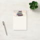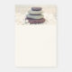 Fästande anteckningar med ett foto med sten staplar ovanpå varandra. Omgiven av lös vit sten och små vita blommor.