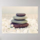 En poster med ett foto med sten staplar ovanpå varandra. Omgiven av lös vit sten och små vita blommor.