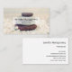 Affärskort med ett foto med sten staplar ovanpå varandra. Omgiven av lös vit sten och små vita blommor.