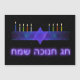En lila och blå avtagbar bild, med en Magen David (David-stjärnan), i mitten, som en Chanukkah-menorah. Ljusen har tänts. Allt på en stjärnbakgrund.
