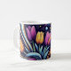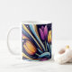 Sip serenity with this timeless ceramic mug, adorned with cosmic swirls and glowing tulips in radiant neon hues—a daily bloom beneath the stars.
