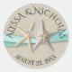 Rustic strädbröllop föredrar ett klistermärke med namn och bröllop. Aqua-bandet och burlap-konstruktionen med stjärnfisk.