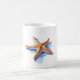 An illustration of an orange starfish that seems to relax on its blue silhouette. Watercolor drawing.