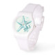Gör en stänk i den här roligten med kiseldammklocka som tar dig till stranden och utanför, med en vattenblå vattenfärgsstjärnfisk på skarp, färsk vit. Lägg till initialer om du vill skapa ett avslappnad mode-tillbehör till ett utomhuskustnära bröllop (underbara matchande skjortor!) eller en sportklocka för sommarresor.