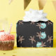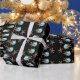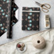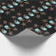 Svart julomslutning papper med ett strandtema. Brun havstjärna och akvablått ornament gör mönster över svart. Tungt papper för inslagning sker på anpassningsbarnas längd.