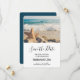 Spara datumkortet med ett scenfoto. En stor stjärnfisk satte sig upprätt på en sandstrand. Ett vackert blåhav med vågar av vit surfa i bakgrunden.