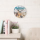 En klocka med ett scenfoto. En stor stjärnfisk satte sig upprätt på en sandstrand. Ett vackert blåhav med vågar av vit surfa i bakgrunden.