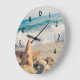 En klocka med ett scenfoto. En stor stjärnfisk satte sig upprätt på en sandstrand. Ett vackert blåhav med vågar av vit surfa i bakgrunden.