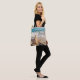 En väska med ett scenfoto. En stor stjärnfisk satte sig upprätt på en sandstrand. Ett vackert blåhav med vågar av vit surfa i bakgrunden.