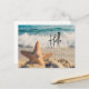 Vykort med ett scenfoto. En stor stjärnfisk satte sig upprätt på en sandstrand. Ett vackert blåhav med vågar av vit surfa i bakgrunden.