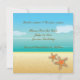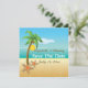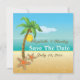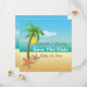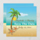Handflatan träd och den tropiska stranden med svältstrand som destination bröllopet Spara datum meddelande som visar en tropisk strand med en handflatan träd med kokosnöt på sanden med svält, blåhav/havsyta och himmel med sol och moln.