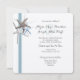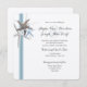 Starfish-dekorerade, tropiska bröllopsinbjudningar. Modern kvadrat papper med bruna, vita och blå havsstjärnor vid sidan. Inbjudningstexten är skriven och tryckt typsnitt, i grått färg, och är inte centrerad, med designen till lämnat. Namn och bröllop ligger i större brev, och det finns en mall för att lägga till mottagningsplatsen adress i grund.