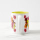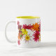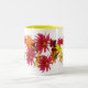 Gör en strålande dag med det här trevliga mugg som har en färgstark design av stjärngazer dahlias i lysande färg av rosa, gult, orange, guld, fuschia och maron på ren vit bakgrund. Fler dahlier är spridda inuti. De kallas stjärngazrar, för till skillnad från den traditionella dahlien har petalerna en udda stjärnform.