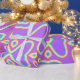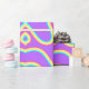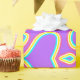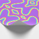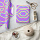 Ett upprepande, symmetriskt mönster i skuggor av lila med ljusblå gult, ljusblå och ljusa tealkonturer som skapar en 3D-effekt. Paletten i färg är livfull och glad och skapar en lekfull och något visuell bild. Att mönstret upprepas gör det till synes oändligt.