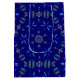 Den här teckningen har en sjudande och symmetrisk abstrakt mönster mot en djup indigo blå bakgrund. Med inslagen kombineras blommigt och geometriskt, med ljusa petalliknande former som ordnas i radiella formationer, liknar stiliserade blommor eller stjärnor. De här petalerna blinkar i elblåa nyanser med subtila gröntar som skapar en dynamisk djup- och energikänsla. Spridningen mellan de större motiven är små kluster av iridescent, bubbelliknande orber i regnbåge - rött, teal, rosa och grönt - som ger en lekfull och futuristiska beröring. I mitten av sammansättningen finns en kaleidoskopisk mandalaliknande sammansättning som består av samma glödande sfärer, som förankrar konstruktionen och förbättrar dess hypnotiska symmetri.