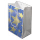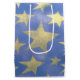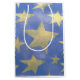 Den här presentpåsen har en fetstilt formad design av ljusa guld-stjärnor på blå bakgrund.