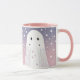 Ett viskigt spöke flyter mellan två stjärnor i en drömaktig gradient himmel i mjuk rosa och lila, omgiven av delikat vitt stjärnigt mönster.