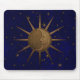 Flott och unik himmelsk mässingsbaslättnad för solen som och för månen är grafisk, med ett fridsamt hand plockademan-på--måne ansikte och solen, rays, över en himmel för starry natt.