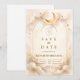 A luminous celestial design featuring delicate crescent moons and scattered constellation stars across a warm parchment background. A refined gold border frames the composition, while elegant script typography creates a graceful focal point worthy of such a meaningful milestone. The soft ivory and champagne tones give the entire piece a timeless, radiant glow. Perfect for a quinceañera celebration that feels romantic, elevated, and touched by starlight.