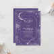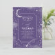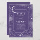 Romantisk mystisk inbjudan till lila och silver förlovningsfest med crescerande måne, jaktstjärna och galaxer.