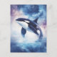 This ethereal postcard features a majestic orca whale leaping gracefully through a dreamlike atmosphere. The killer whale's body is beautifully textured with deep blue and indigo watercolor, speckled with a shimmering field of white stars. Above, a vibrant purple and blue galaxy swirl is filled with brilliant stars and nebulae, while the whale emerges from misty, light blue waters below. The soft-focus background and magical lighting create a powerful sense of wonder and celestial beauty. This postcard is an ideal choice for sending an inspirational message, a thoughtful note to a marine life lover, or for use as a piece of dreamy, nature-inspired wall decor.