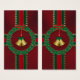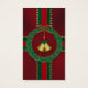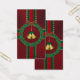 Golden klockor hänger i mitten av en grå andedräkt av mörk löv och röda ädelstenar för bär, genomskärt av rosett band av rött och grönt med guld stjärnor. Som ett Julklapp inslaget i mörk rött och bundet med ljust strippat rosett band.