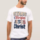 Den här designen har en vit t-shirt med texten "STARS & Rand" i tan och rött, ovanför "JESUS" fylld med stars och stripes mönster och "Kristus" på mörk blått.