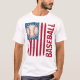 Den här vita t-tröjan har en baseboll som läggs ovanpå en amerikansk flagga. Basbollen är vit med rött stygn, medan flagga har den traditionella röda och vita rand och blå kvadraten med vita stjärnor. Ord "BASEBALL" trycks vertikalt i rött längs högerna. Visa kärlek för Amerika och baseboll med den här snyggten-garantin!