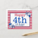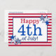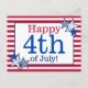 Den här festliga, patriotiska designen har blå och vita stjärnor och röd rand i färg i den amerikanska flagga, tillsammans med ord "Lycklig 4 juli," i kontrasterande färg och storlekar i populär typografi, skapar detta en perfekt färgstark design för helgdag. Baksidan av vykortet har ett lätt överlägg av stjärnor i hörnen samt ett anpassade-meddelande och namnteckning linje så att du kan anpassa det efter behov. En returadress av anpassadet finns också på baksidan för att förenkla din helgdag.