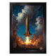 En "Breathtake Retro Fusion Rocket Launch in to Cloudy Sunset Himlar AI Concept Art" av Xzendor7. Den har en raketfrakt som stiger upp i himlen, dess kraftfulla motorer som avger ljus orange och tjocka rökplommon när den eleganta, gyllene raketen stiger kraftigt in i luft.