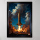 En "Breathtake Retro Fusion Rocket Launch in to Cloudy Sunset Himlar AI Concept Art" av Xzendor7. Den har en raketfrakt som stiger upp i himlen, dess kraftfulla motorer som avger ljus orange och tjocka rökplommon när den eleganta, gyllene raketen stiger kraftigt in i luft.