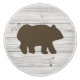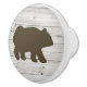 En brunbjörn över ett vitt trädplank, bakgrunden