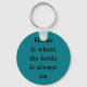 Turkos nyckelring hemma. Läser "Hemmet är alltid där vattenkokare är på".