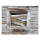 Kvarlevorna av ett gammalt tecken i fönstret på en förfallen lada.