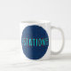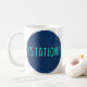 Mugg har Station-logotypen i blått med en rundad tweed-bakgrund på båda sidor.