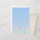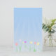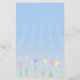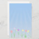 Klassikervår blommor; tulpan och påskliljar, är i nätt pastellfärgade rosor, lilor och gult på ett ljust - blå himmelbakgrund med en glänsande ljus sunburst besegrar. En vit- och lilafjäril flits bland blommorna.