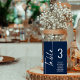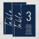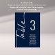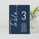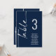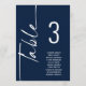 Sittdiagram för det vita Bordsnumret Namn i skript. Redigera numret för varje bord och lägg till i kundvagnen separat. Samma utformning finns på båda sidor, använda för en hängande visning så att gästerna kan hitta sitt säte eller på varje bord. I klassisk marin blått med vit skrift. Anpassa enkelt bordsnumret och din gäst namn. Samma utformning finns på båda sidor och kommer att uppdateras samtidigt när du byter ord till ditt eget.
