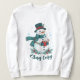 A charming winter illustration featuring a stylish snowman dressed in a cozy patterned scarf and elegant top hat, holding a warm cup of hot cocoa. Surrounded by snowflakes, pine branches, and festive red berries, this design brings a warm and joyful holiday feeling.